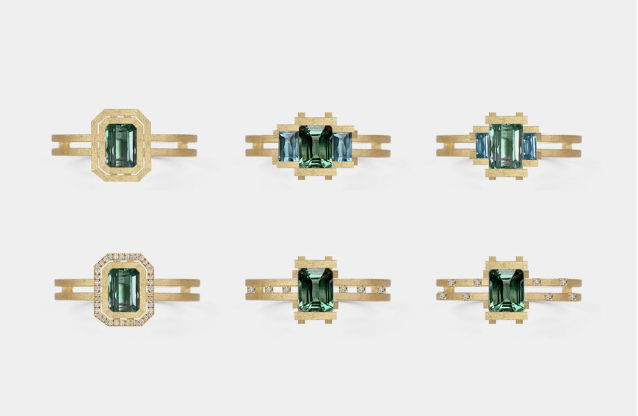 This engagement ring features a vivid blue aquamarine at its centre with brilliant cut white diamonds set around the band. Hand constructed in 18ct yellow gold it is built for everyday wear with contemporary detailing and shimmering texture.