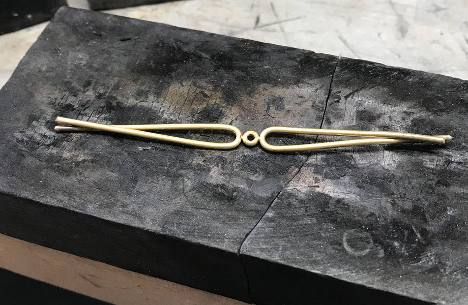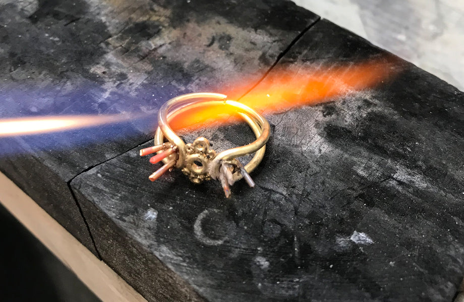 This bespoke engagement ring creates the infinity sign with the bands looping over one another at the request from our client. The ring is handmade in polished 18ct yellow gold and is set a beautiful arrangement of hand selected with emeralds and recycled white diamonds.