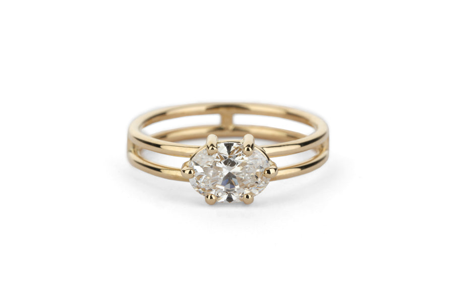 This simple but stylish ring features an oval white diamond which is set east to west. Elegantly held with six claws on a fine double band, this style is comfortable on the finger and perfect for everyday wear.