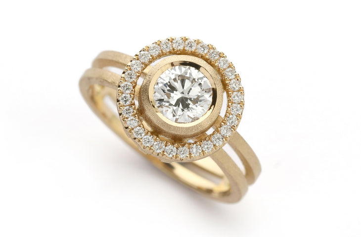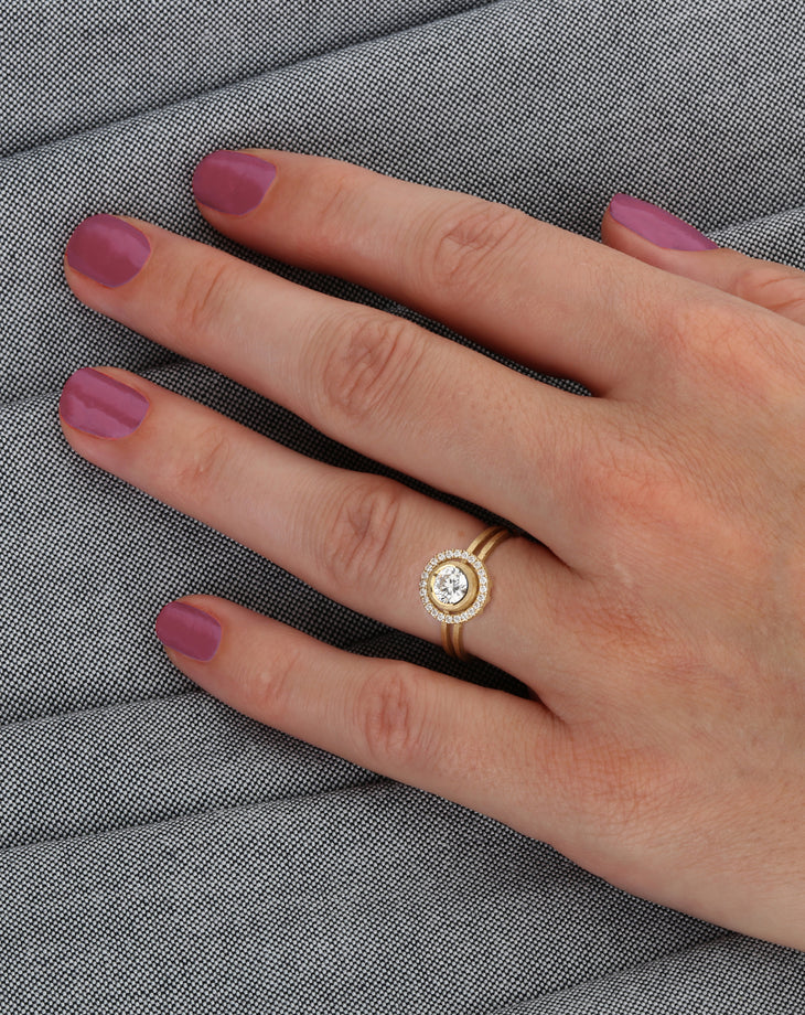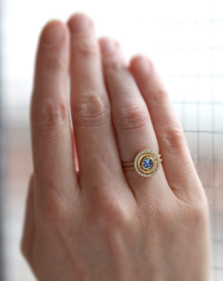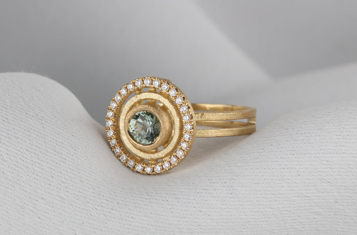 Target rings offer versatility and adaptability, where you can specify the central gemstone and surround, making them an ideal choice for a unique engagement ring. Our contemporary version of this style is the Solar Ring, which features a round gemstone surrounded by a gold circle and then a circle of white diamonds. This modern version celebrates the circle and showcases our love of geometry and simple structure.