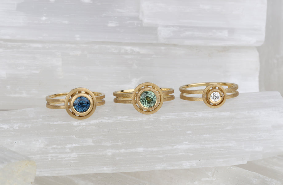 A softer version of our Symmetry style solitaire rings can be found in our Horizon Collection. Here, round wire is fabricated to create layered structure and detail while using the open compass setting. These can only be made with a round centre stone due to the complication of the construction of the setting surround. We have made many beautiful customised colourways of our Horizon Halo Ring.