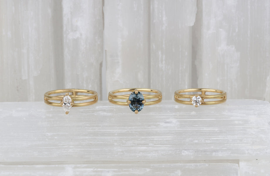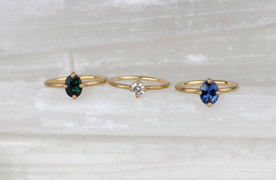 Among them, our Solo Ring stands out as the most minimal and delicate, closest to the classic solitaire style. Designed to sit low on the finger, it features a subtle seat for the gemstone and compass-style claws set in the cardinal directions: north, east, south, and west, ensuring both security and simplicity. Crafted with round wire, the Solo Ring exudes a soft shaping of the 18ct gold. There is the option to choose from a variety of diamond or sapphire shapes, though round and oval remain favourites.