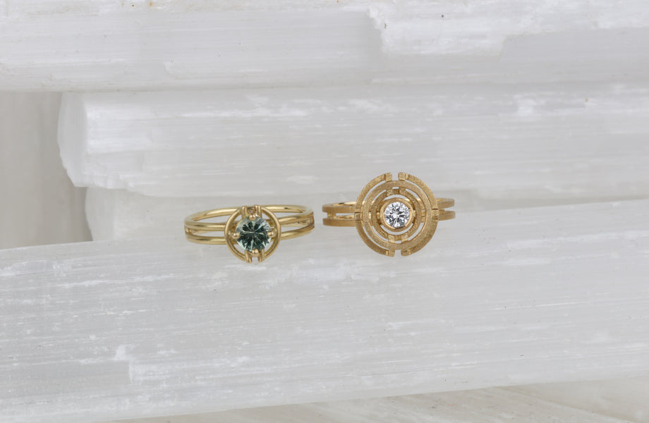 Our most decorative of all the solitaire styles are the rings from our Symmetry collection. They all feature variations of structural pattern-work around the central gemstone. From simple to complicated, this style is for someone wanting a little difference. These rings truly exude our love of mathematics and geometry while also giving the feeling of ancient architecture. The hand fabrication of these rings ensures that they are durable. We have created many bespoke variations of this style.