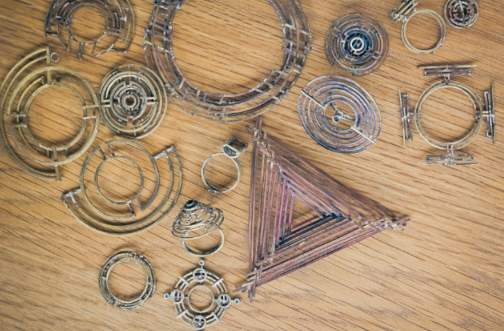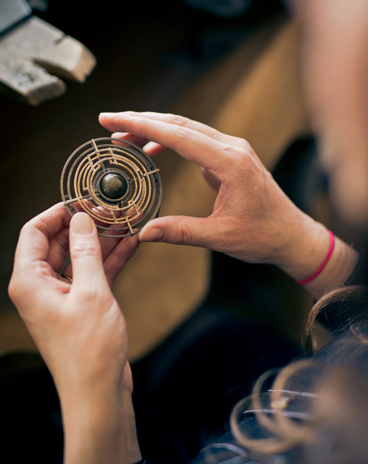 Hand-fabrication of drawn wire is a core process within our practice. We have developed unique gemstone bezel setting techniques and a signature textural finish. Each piece celebrates the simplicity of its parts, whether minimal or complex. We design jewellery that showcases the structure, the joins and intersections, which can reveal larger pattern work in our more intricate pieces. The balance and geometrical alignments can feel both modern and ancient and we love this timelessness.