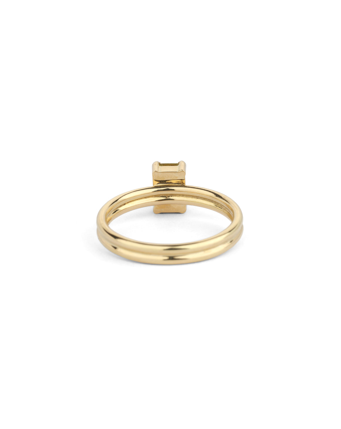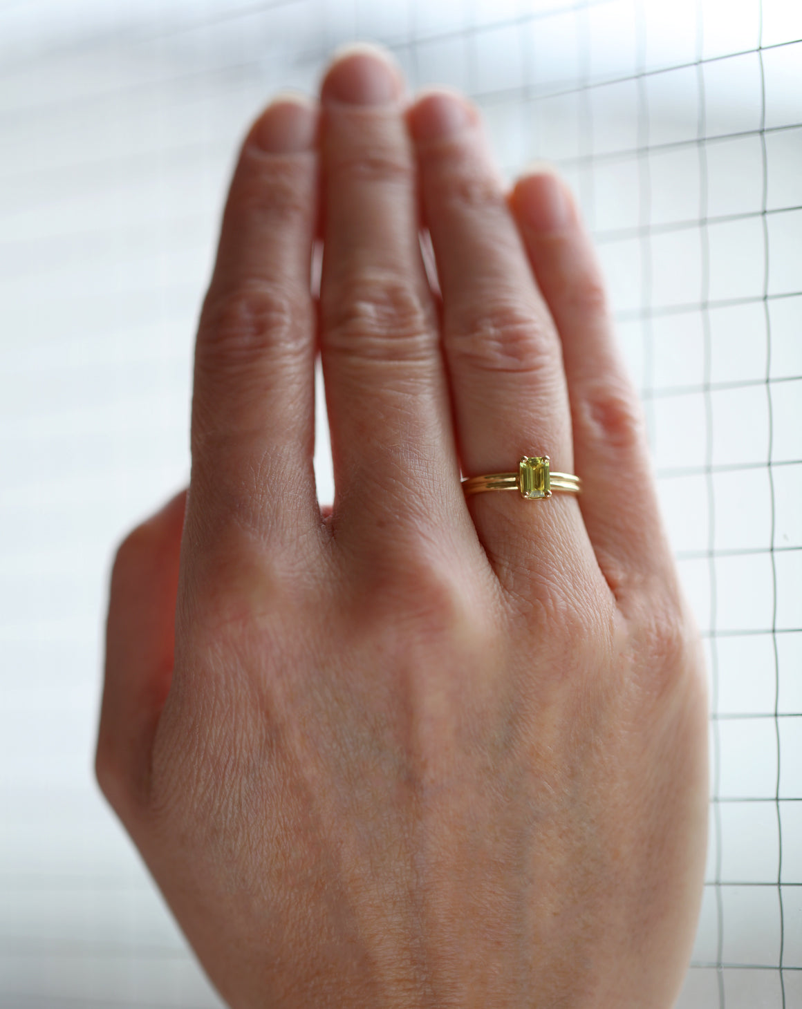 A classic solitaire ring with a modernist twist, featuring two bands forming the shank and an emerald-cut sapphire. Hand-formed using traditional goldsmithing techniques, the ring is imbued with strength and durability.