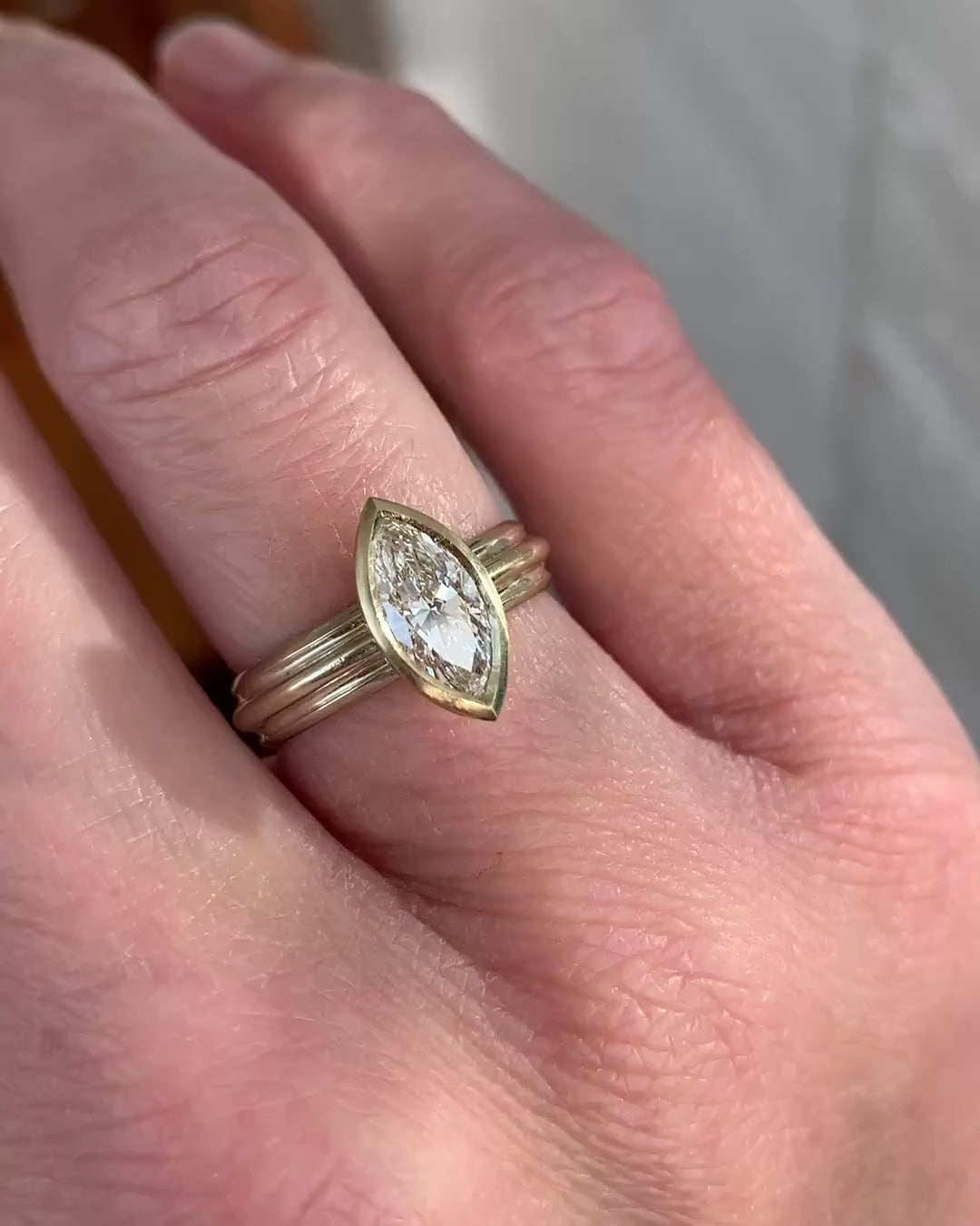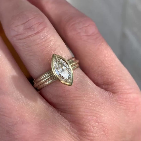 Inspired by ancient aesthetics and mathematical precision, this design brings together sculptural form and tactile detail. The fluted band echoes classical column structures, while the shaped setting cradles the pointed navette diamond in a seamless, harmonious pairing. The result marries linear rhythm with curved softness.